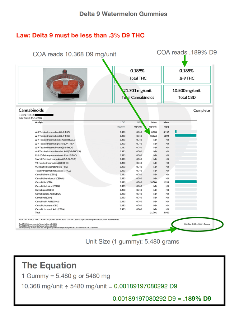 He wanted to know why it read .189% Delta 9 at the top, but 10.368 in the analyte table. He noted the unit size at the bottom of the page was a gummy weighing 5.480g.