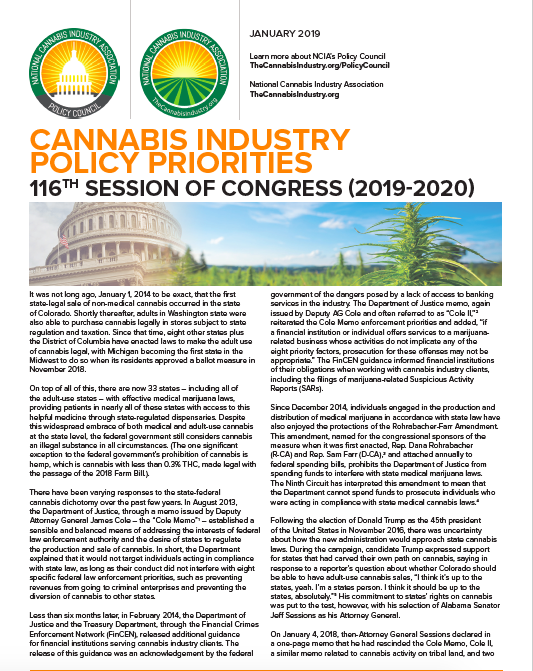 NCIA’s “Cannabis Industry Policy Priorities: 116th Session of Congress (2019-2020)” focuses on how given the pace of change at the state level and the support for cannabis policy reform at the highest level of the federal government, it seems clear that we are at a critical juncture in the history of federal cannabis policy. This paper details NCIA’s stance on how key federal policy priorities should change in this 116th session of Congress.