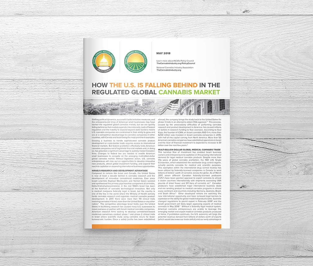 In this paper produced by NCIA’s Policy Council, we explore how the lack of federal regulation and the inability to expand beyond state borders means U.S. cannabis companies are constrained in their ability to grow and are at a competitive disadvantage to cannabis companies in other countries, with Canada and Israel being the most prominent examples. (October 2018)