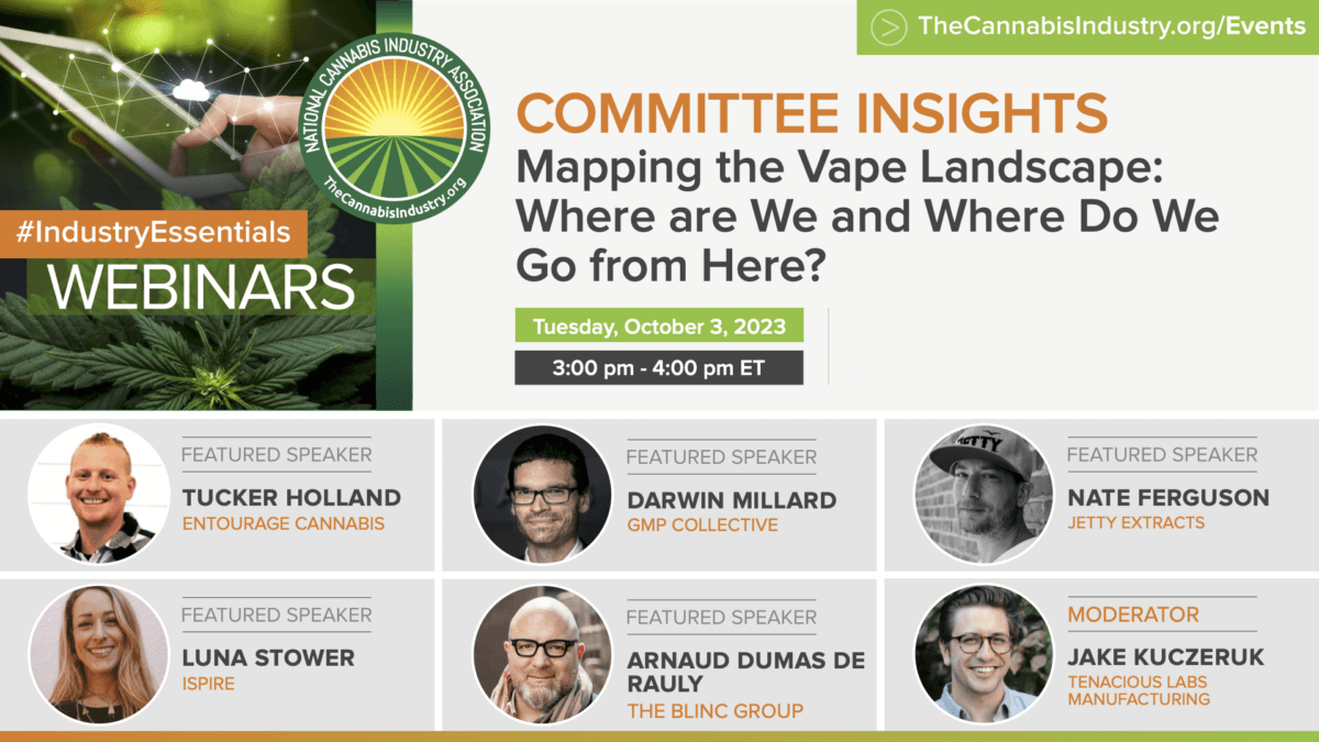 Welcome to the recorded session of our webinar, “Mapping the Vape Landscape: Where are We and Where Do We Go from Here?” In this engaging discussion, hosted by NCIA’s Cannabis Manufacturing Committee, we dive into the dynamic world of vaping in the cannabis industry.